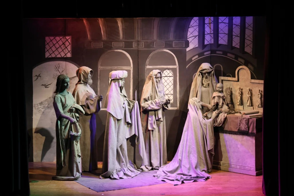Coupled with stunning, hand-painted sets, thoughtful readings and carefully determined lighting, the scenes have a bold and effective impact on the audience members. Angelic choral music is perhaps the key to this deep impact as scenes are accompanied by the LHS choir, formed of pupils in Year 10 and above. Following months of rehearsals, the soundtrack creates an ethereal atmosphere that brings all elements of the performance together seamlessly.